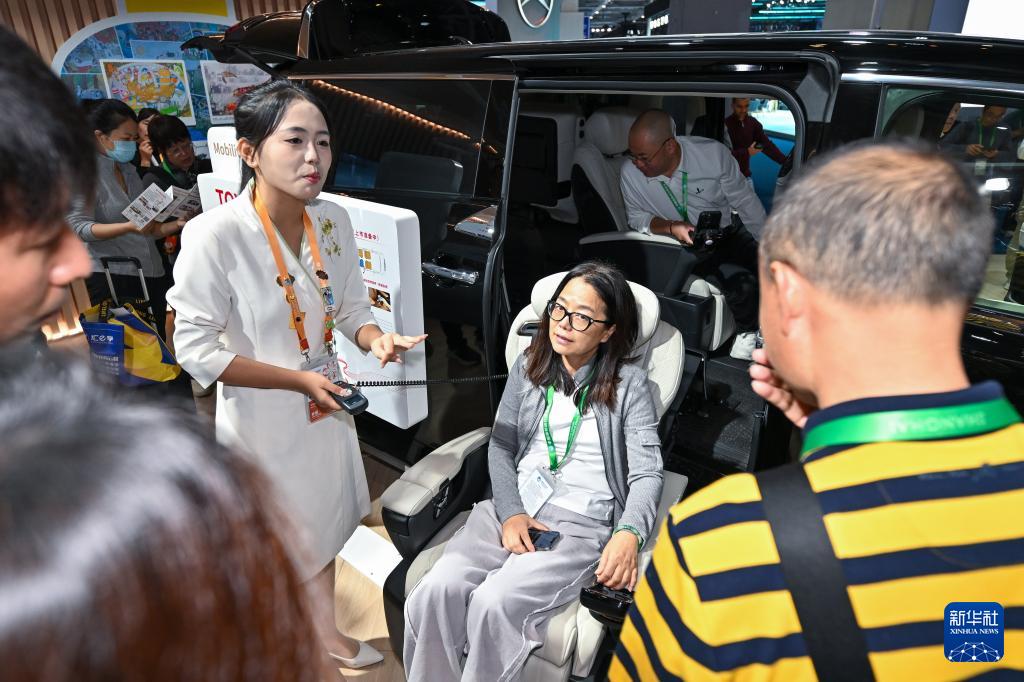 11月8日,在第八屆進博會汽車及智慧出行展區豐田展位,觀眾在體驗一款福祉車。這款福祉車搭載電動升降旋轉座椅,便于肢體障礙人士乘車。