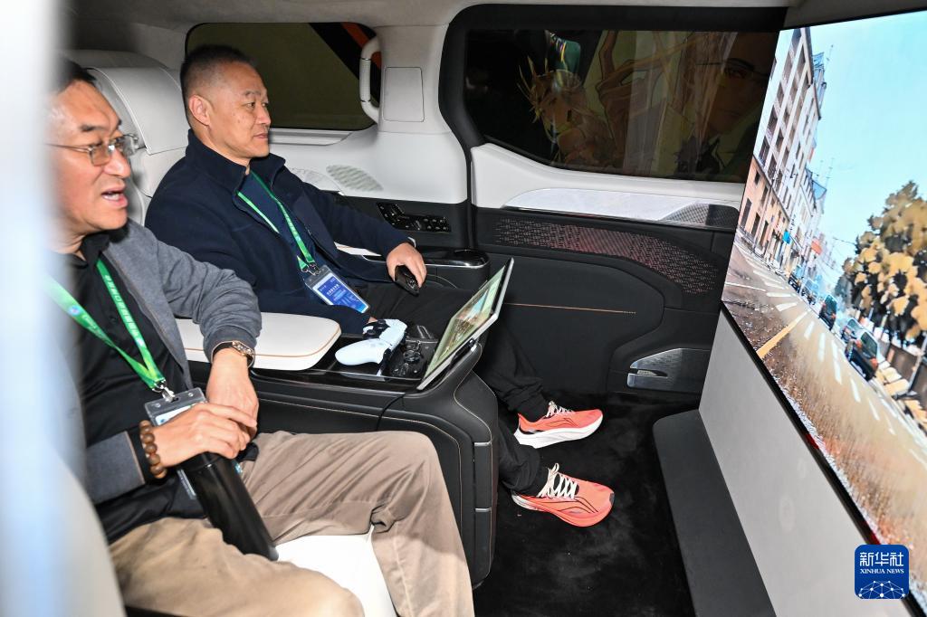 11月8日,在第八屆進博會技術裝備展區索尼展位,觀眾在沉浸式座艙內體驗索尼車載娛樂系統。這款車載娛樂系統可藝術化渲染車窗外動態景觀,提升乘客的出行體驗。
