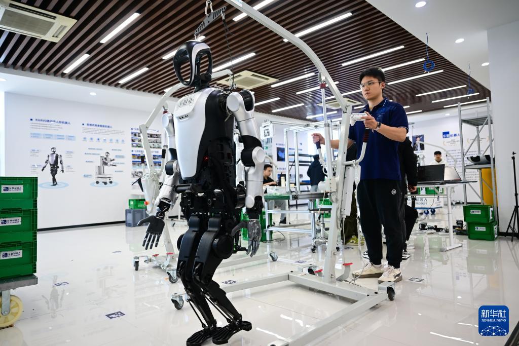 10月24日,張鴻偉操控人形機器人,準備進行測試。新華社記者 杜瀟逸 攝