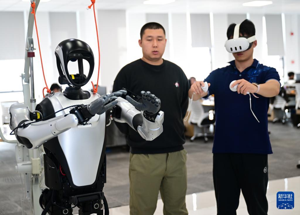 10月24日,張鴻偉(右)在同事的指導下使用VR設備進行機器人遙操作,用于動作捕獲采集數(shù)據(jù)。新華社記者 周牧 攝