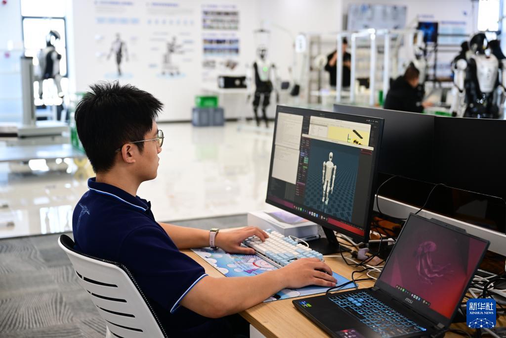 10月24日,張鴻偉在電腦上查看人形機器人的測試運行數(shù)據(jù)。新華社記者 杜瀟逸 攝