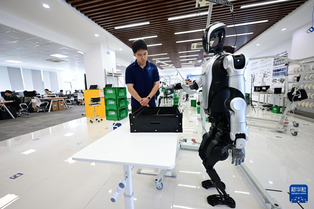 10月24日,在合肥樂聚機器人技術有限公司,工作人員觀察人形機器人搬運塑料筐的測試情況。新華社記者 杜瀟逸 攝