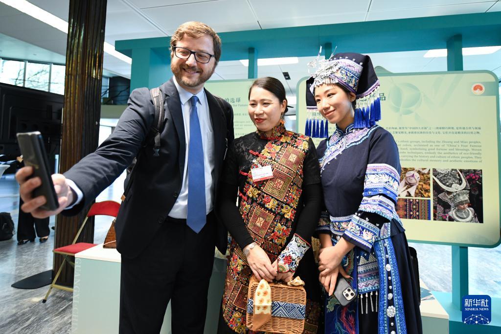 11月17日,在瑞士日內瓦世界知識產權組織總部,一名參觀者在“中國(廣西)地理標志產品展”上與身著民族服飾的工作人員合影。