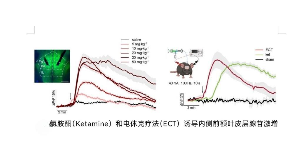 研究團隊借助基因編碼腺苷探針GRABado和光纖光度測量技術,實現了小鼠腦區腺苷濃度的實時監測。實驗發現,氯胺酮和電休克治療均能快速且持續升高小鼠內側前額葉皮層與海馬體的腺苷水平,而這一區域正是情緒調節的關鍵腦區。通過遺傳學與藥理學驗證,研究團隊確認腺苷A1和A2A受體是抗抑郁效應的必需條件,敲除或阻斷這兩種受體后,兩種療法的抗抑郁作用均完全消失。