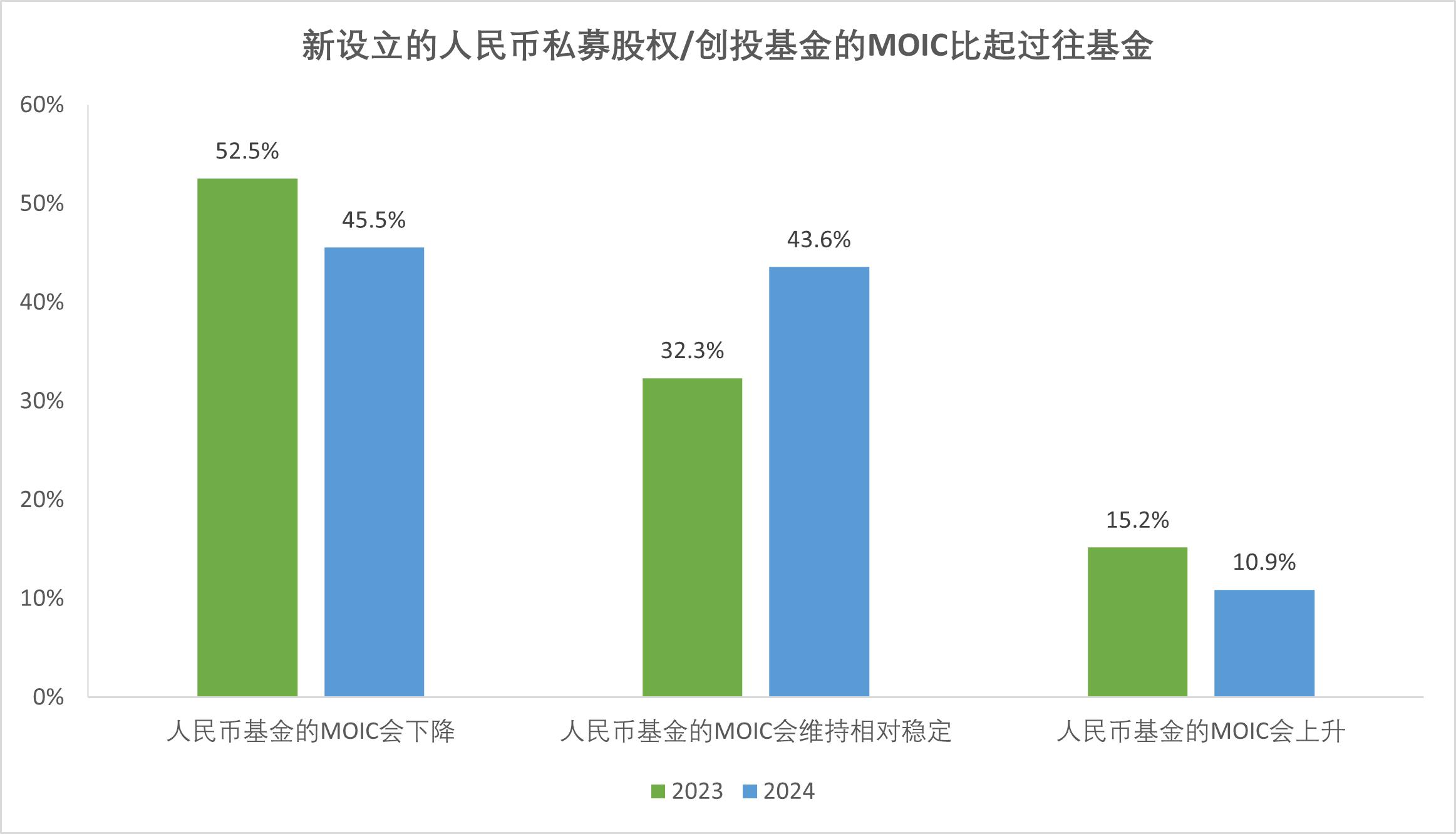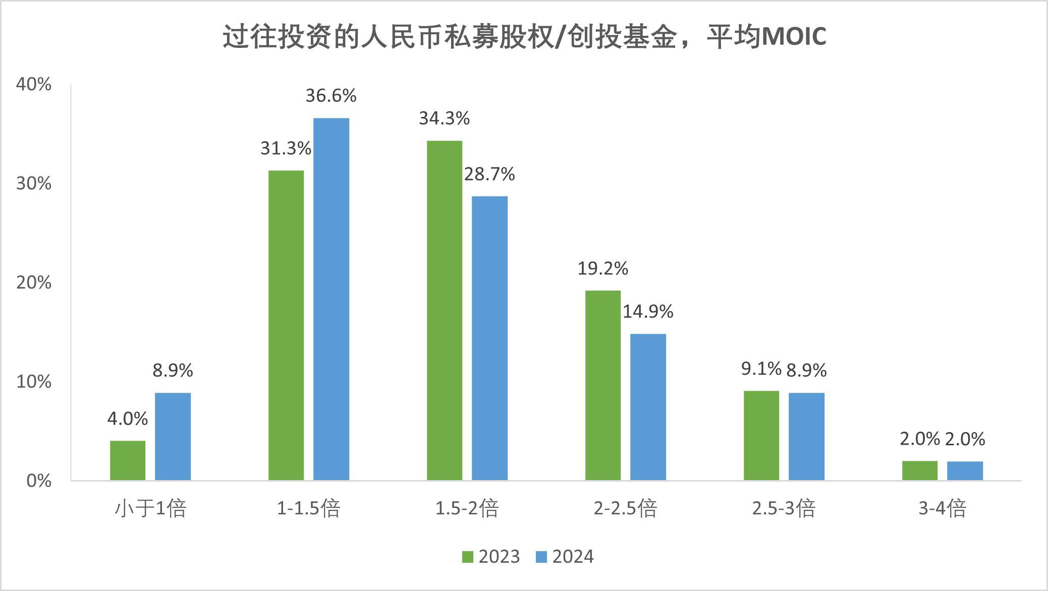 超六成(64.4%)機(jī)構(gòu)MOIC在1x-2x之間,僅2.0%達(dá)3x以上,多數(shù)投資尚未實(shí)現(xiàn)高倍數(shù)收益;45.5%預(yù)期MOIC降低。