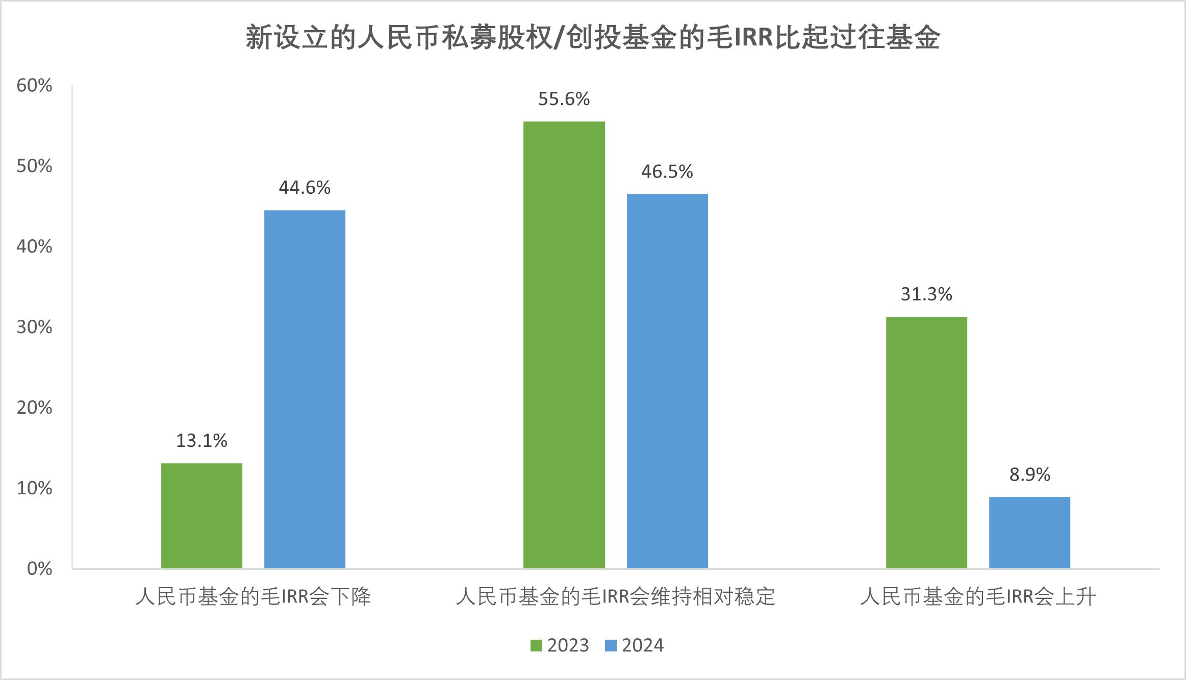 調(diào)研結(jié)果顯示,IRR主要集中在5%-20%區(qū)間(63.4%),仍有16.8%的機(jī)構(gòu)IRR低于5%,人民幣基金業(yè)績(jī)分化明顯;44.6%預(yù)測(cè)新基金IRR將下降。