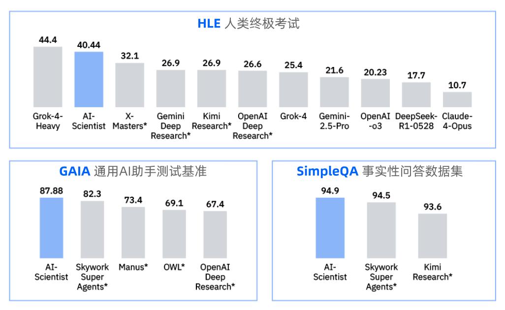 AI-Scientist基于中科聞歌自研智能體框架,在全球權威通用智能體榜單中表現出色,其中 GAIA與 SimpleQA雙榜全球登頂,HLE排名國內第一,科學工具調用和科學推理能力國際領先。