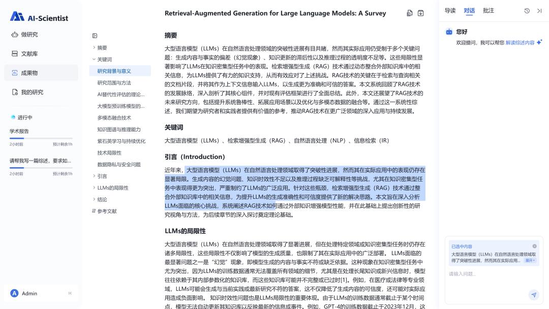 AI-Scientist是一款具備多學科知識體系與科研流程認知的“智能科研助手”,能夠理解科研語言、知識結構與思維邏輯,助力科研人員高效完成文獻調研、知識組織與內容生成等關鍵任務。