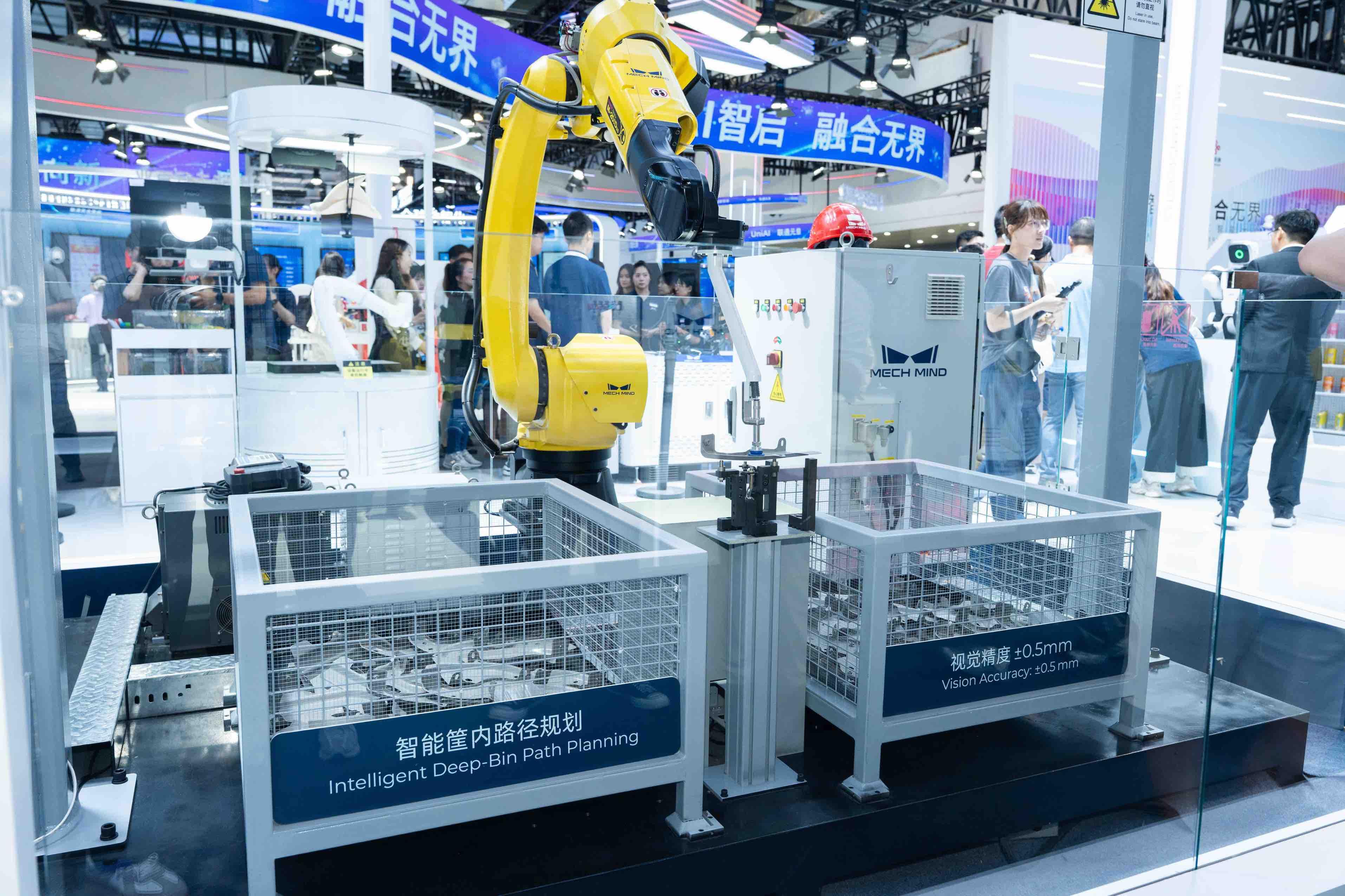“梅卡曼德的AI視覺系統能夠應對鈑金件反光、異形、亂序堆疊等復雜工況,在大于3米的距離下精準識別鈑金件及其關鍵特征,視覺精度達±0.5毫米。”邵天蘭以WAIC 2025展臺中的AI視覺引導鈑金件深筐無序上料應用場景為例解釋說。