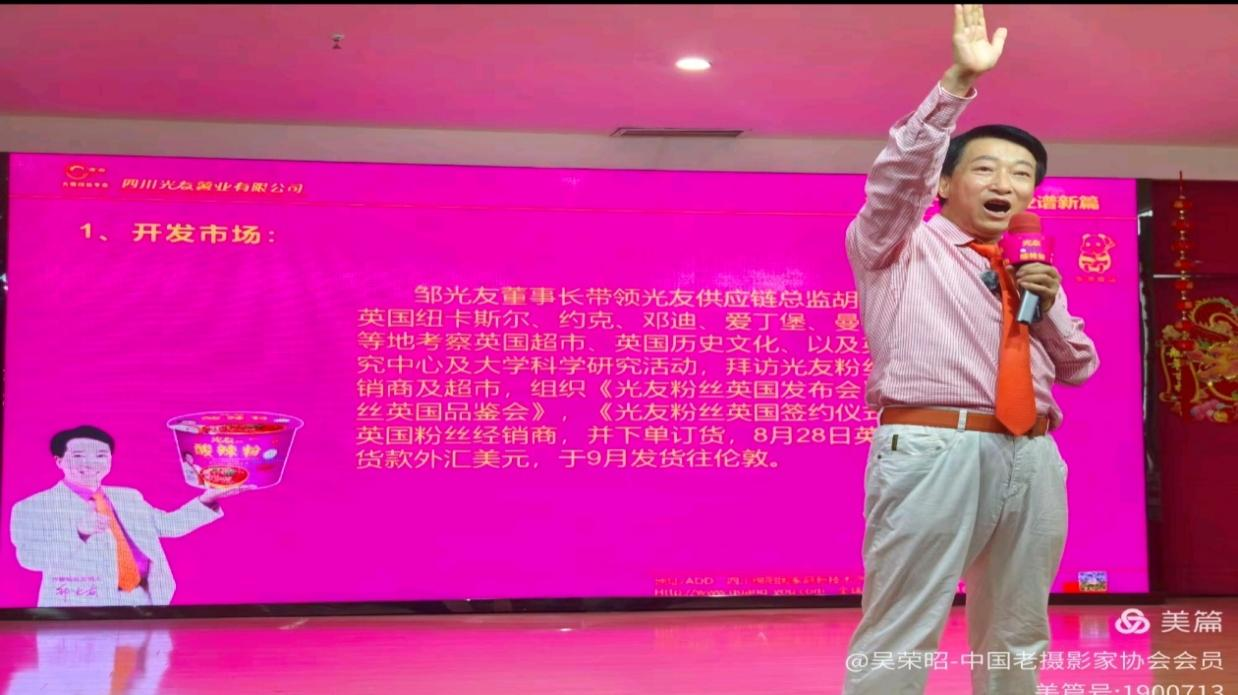鄒光友到現場感悟發小視頻,說:“牛頓發現萬有引力,今天,人人有引力,每種商品有引力,光友酸辣粉在英國有引力。光友酸辣粉吸引了英國人、吸引了中國人、吸引了世界人、吸引了線上線下的各位粉絲寶寶,這就是相互吸引,這就是萬有引力的效應。光友酸辣粉吸引英國朋友,英國朋友吸引了光友酸辣粉,人與人之間就有相互吸引力。”