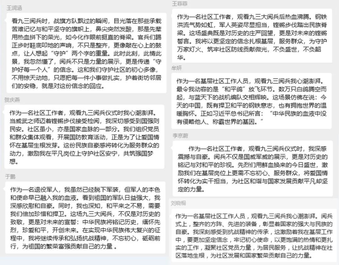 觀看結束,社區黨組織還特別設置了“初心分享”環節。黨員和群眾結合自身經歷,暢談對歷史的理解、對當下的感悟。“作為一名基層社區工作人員,我將繼續思為民服務之責、添干事創業之勁。今后,海越社區將把今天激發的澎湃熱情,轉化為扎根社區、服務居民的實際行動,以更加飽滿的熱情、更加務實的作風,投身到社區工作中,為筑牢黨的執政根基、構建和諧美好社區、實現中華民族偉大復興的中國夢貢獻堅定力量!”社區黨總支書記的發言引發共鳴。大家紛紛表示,要把閱兵式中感受到的愛國熱情和民族精神,轉化為服務群眾的實際行動,在化解鄰里矛盾、推進基層治理、開展志愿服務中踐行使命。