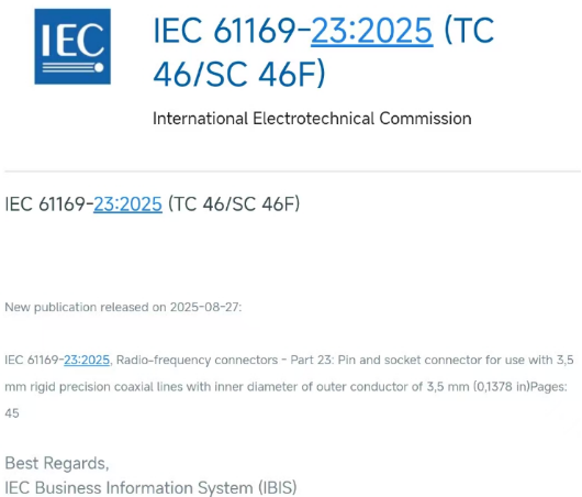 近日,從國際電工委員會(IEC)傳來令人振奮的消息:由蘇州華旃航天電器有限公司(以下簡稱“蘇州華旃”)主導(dǎo)制定的IEC61169-23:2025《射頻連接器第23部分:接3.5mm硬精密同軸線、外導(dǎo)體內(nèi)徑為3.5mm(0.1378in)的射頻同軸連接器》國際標準正式發(fā)布!這不僅是中國企業(yè)在國際射頻連接器領(lǐng)域話語權(quán)的重大突破,更是蘇州高新區(qū)以高標準助推高端裝備制造邁進的新里程碑。