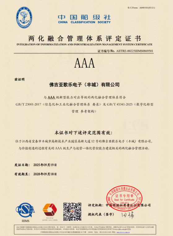 兩化融合是信息化和工業化高層次的深度結合,兩化融合管理體系是我國首個覆蓋兩化融合全局、全要素、全過程的管理體系標準。AAA級認證是兩化融合管理體系開放申請的最高評定等級,代表企業在數字化轉型中已達到“領域級”領先水平。此次通過認證,不僅彰顯了佛吉亞歌樂在智能制造與數字化管理方面的硬實力,更標志著宜春豐城高新區在推進兩化深度融合方面邁上了新臺階。