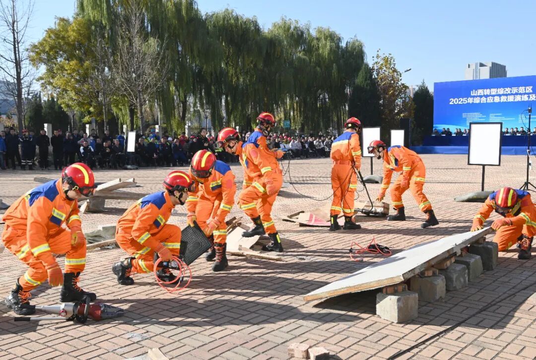 11月13日,山西轉(zhuǎn)型綜改示范區(qū)舉行2025年綜合應(yīng)急救援演練及裝備展。山西轉(zhuǎn)型綜改示范區(qū)黨工委委員、管委會副主任陳曦出席并講話。