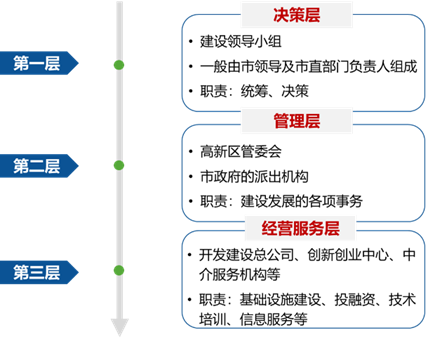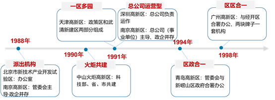 1988年,國務院批準實施火炬計劃,明確把創辦高新區作為火炬計劃的重要內容;同年,批準建立第一個國家高新區——北京市新技術產業開發試驗區(以下簡稱“北京試驗區”),也就是中關村科技園區的前身,批準頒布《北京市新技術產業開發試驗區暫行條例》,拉開了我國建設國家高新區的序幕。北京市政府根據該《暫行條例》發布實施細則,明確規定北京市試驗區辦公室是海淀區人民政府的派出機構 ,在海淀區人民政府領導和市科委指導監督下,具體辦理新技術企業的審批核定事宜。同年7月,為加強對北京試驗區的領導和協調工作,北京市政府牽頭組建了北京試驗區協調委員會 ,由北京市副市長任委員會主任,北京試驗區辦公室兼協調委員會辦公室職能。北京試驗區的建設模式為后來國家高新區組建領導小組,成立作為政府派出機構的管委會奠定了重要基礎。在中關村科技園區成功探索的基礎上,1991年和1992年,國務院先后批準建立了51家國家高新區,全面啟動國家高新區建設。為貫徹落實黨中央、國務院的指示精神,1991年,原國家科委和國家體改委研究制定了《關于深化高新技術產業開發區改革,推進高新技術產業發展的決定》,進一步明確了國家高新區改革的基本方向、原則和思路,明確國家高新區要根據發展社會主義有計劃商品經濟的要求,建立起符合商品經濟運行規律,適應高新技術產業發展要求和國際慣例的體制、機制;各開發區要因地制宜地建立決策、管理機構,賦予相應的權限,代表當地政府行使行政職權, 統一對內對外,集中有效地協調解決開發區發展中的重大問題,并在工商、稅務、財政、金融、國際合作交流、外貿、進出口等方面形成配套、高效的服務功能,為企業提供綜合服務。在1988年到2000年的“一次創業”階段,國家高新區發展到53家,成為我國高新技術的集聚地和成果轉化、產業發展的增長極。由于這一階段高新技術產業發展基礎總體薄弱,需要強有力的管理機構創造發展環境,同時借鑒了當時國家經開區的管理經驗,大多高新區采取較封閉的管理模式,探索集中授權管理。 初步形成了具有中國特色的“領導小組+管委會+公司” 管理架構,實行“決策層-管理層-服務層” 開放式管理模式。其中,“決策層”即由市政府主要負責人及市政府有關行政管理部門負責人組成的領導小組,為強化政府的作用,一般由市級主要領導擔任領導小組組長。主要負責宏觀決策、重大政策制定、用地規劃、協調解決高新區開發建設及管理過程中的重大問題等?!肮芾韺印奔醋鳛檎沙鰴C構的管委會,代表當地政府行使政府職權,對園區實行統一領導,負責具體發展規劃、建設和管理等職責?!胺諏印奔丛O立園區開發建設公司、創新創業中心等,負責園區基礎設施建設、投融資、創業孵化等功能。實踐中,各國家高新區也結合自身實際情況,逐步探索適宜區域特征、順應市場經濟發展的多樣化管理體制 。如南京高新區創建初期采取以管委會為主導的政企并存模式;海南高新區、深圳高新區采取以企業、總公司為主導的管理體制;桂林高新區由具有一定行政職能的事業單位來實行企業管理;中山、廈門和威海三個國家高新區,由原國家科委、省科委和當地政府合辦,被命名為火炬高新區,在行政管理的基礎上,成立開發總公司,負責高新區基礎設施建設、新技術產業投資和部分公共事務管理。