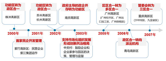 二、“二次創業”階段:深化“精簡、高效”改革,積極探索經濟與社會統籌管理機制 進入21世紀,國內外經濟形勢發生巨大變化,中國加入WTO,科技創新成為我國發展主旋律。2001年,科技部在總結前一階段國家高新區建設經驗的基礎上,研究提出了國家高新區“二次創業”的新任務和新目標,核心是要推進“五個轉變”, 從第一階段的外延式發展向更加依靠科技創新的內涵式發展階段轉變,更加注重“創新驅動、內生增長” 。2002年,科技部印發《關于國家高新區管理體制改革與創新的若干意見》,指出國家高新區要建立適應社會主義市場經濟要求和高新技術產業發展規律、符合WTO規則的管理體制和運行機制,國家高新區管理機構要按照“精簡、高效、優質”的原則不斷推進職能轉變 ,進一步提高管理效率和靈活度。“二次創業”期間,國家高新區普遍加強了內涵式和外延式相結合、引進大企業和培育小企業相結合的發展力度,不僅大力引進國內外研發機構、科教資源和龍頭企業進駐,而且著力營造創新創業氛圍,建設不同類型的科技企業孵化器,運用各種政策手段和市場力量,推動內生發展動力的增長,形成了研發機構密集、大企業和小企業和諧共生的產業鏈條。同時,國家高新區也不再是單純的產業園區,而是形成了產城融合的具有現代化形象的科技新城和城市新地標, 不僅增強了創新活力和發展實力,而且提高了示范、輻射、引領和帶動作用,成為宜居宜業的創新創業高地,相應也帶來諸多社會事務管理方面的新挑戰 。經過十余年的發展,特別是產業規模的迅速擴大,部分國家高新區面臨空間緊缺的瓶頸,于是采用了不同方式,擴大管理范圍,拓展發展空間 。同時,現實中的不完全政府模式、不明晰職能邊界導致的矛盾日益凸顯,管理體制機制不順成為制約國家高新區創新發展重要因素。為此,國家高新區先后開啟了不同類型、不同程度的新一輪管理體制改革 。如株洲、青島、桂林、蘇州等高新區為解決空間不足、社會事務難以協調等問題,將高新區與行政區合并或建立新區;上海紫竹采用多元化的股權結構,形成民營企業、高等院校、市區鎮政府“三結合”運營模式,成為全國首家以民營企業為開發主體的開發區;廣州高新區進一步與新組建的蘿崗區合并,重慶高新區與沙坪壩區、九龍坡區等的鄉鎮街道合并實現擴容升級,等等;形成包括區區合一、政區合一和多區合一模式。