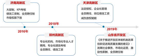 三、“創新驅動戰略提升”階段: 加快轉變政府職能,著力推進市場化改革 黨的十八大以來,改革進入了深水區,開放邁向了新階段,創新驅動發展成為國家戰略,國家高新區進入“創新驅動、戰略提升”階段 。黨中央、國務院高度重視轉變政府職能,把“放管服”改革作為全面深化改革的重要內容,持續推進簡政放權,實行放管結合,優化行政服務,以市場在資源配置中起決定性作用和更好發揮政府作用為目標,著力破解制約科技創新活力的體制機制障礙。2013年,科技部出臺《國家高新區戰略提升行動方案》,提出國家高新區要積極建設服務型政府,形成國家、地方、社會等各方力量聯合治理新模式。2017年2月,國務院辦公廳出臺《關于促進開發區改革和創新發展的若干意見》(國辦發[2017]7號),提出開發區要將政企分開、政資分開,行政剝離、市場化運作作為下一步改革的重點方向。2020年7月,國務院出臺《關于促進國家高新技術產業開發區高質量發展的若干意見》(國發〔2020〕7號),對國家高新區深化管理體制機制改革作出頂層設計 ,要求國家高新優化內部管理架構,實行扁平化管理,探索崗位管理制度,實行聘用制,建立完善符合實際的分配激勵和考核機制,并賦予國家高新區相應的省級和市級經濟管理權限。綜合來看,我國正處于轉變發展方式、優化經濟結構、轉換增長動力的攻關期,國家高新區過去依賴政策紅利、政府主導色彩濃厚等長期積累的問題逐漸顯露,面臨著要素成本制約、政策優勢減弱、區域內外競爭壓力增大、發展活力不足、發展動能減弱等困境,因此積極轉變政府職能、引入市場化效率機制勢在必行。圍繞“放管服”深化改革,一批國家高新區開始積極探索符合新時代要求的行政審批、組織機構、人事管理、薪酬激勵新機制,著力構建精簡高效的管理服務體系 。如2016年濟南高新區堅持問題導向,圍繞“企業化管理、市場化運作、專業化服務”目標,推行機構大部制、實行全員聘任制、改革干部考評體系、采用績效工資制、深化簡政放權,激發高新區發展創造力。2019年天津濱海高新區依據自身為功能區的本質,推行法定機構改革,目標是去除行政事業身份,全面引入市場化經營理念和企業化激勵機制。2020年,玉溪高新區、蘭州高新區等圍繞強化經濟發展和創新促進功能,探索開展全員聘任制、績效考核制、薪酬激勵制等改革,以進一步激發廣大干部的干事創業熱情。