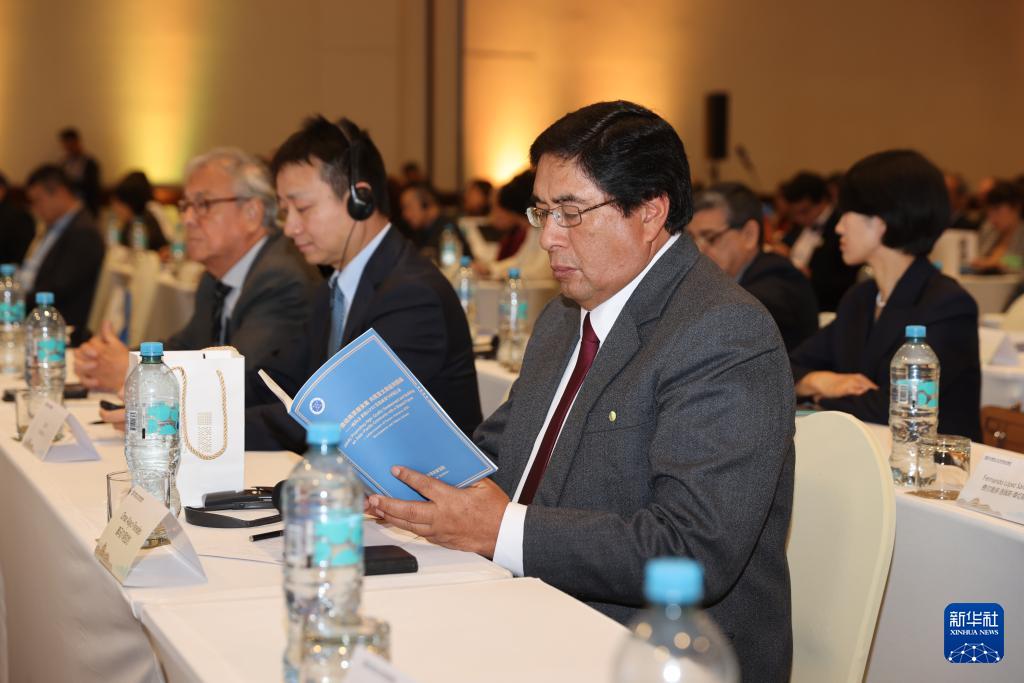 11月8日,在秘魯首都利馬,嘉賓翻閱智庫報(bào)告。新華社記者 李夢馨 攝