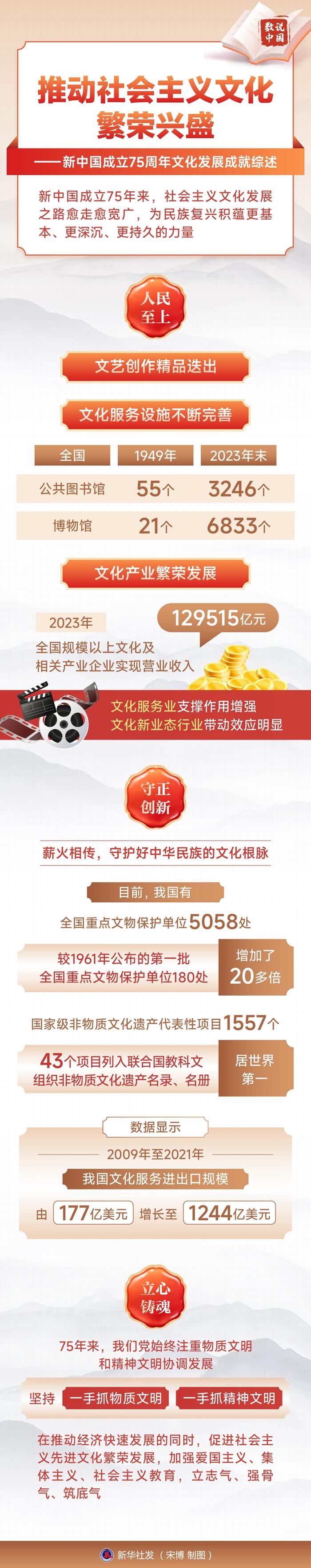 國家之魂,文以化之,文以鑄之。75年來,我國著力建設中華優秀傳統文化傳承發展體系,積極推進文物保護利用和文化遺產保護傳承工作,以自信開放的姿態更好推動中華文化走出去,中華文化煥發新的時代光彩。