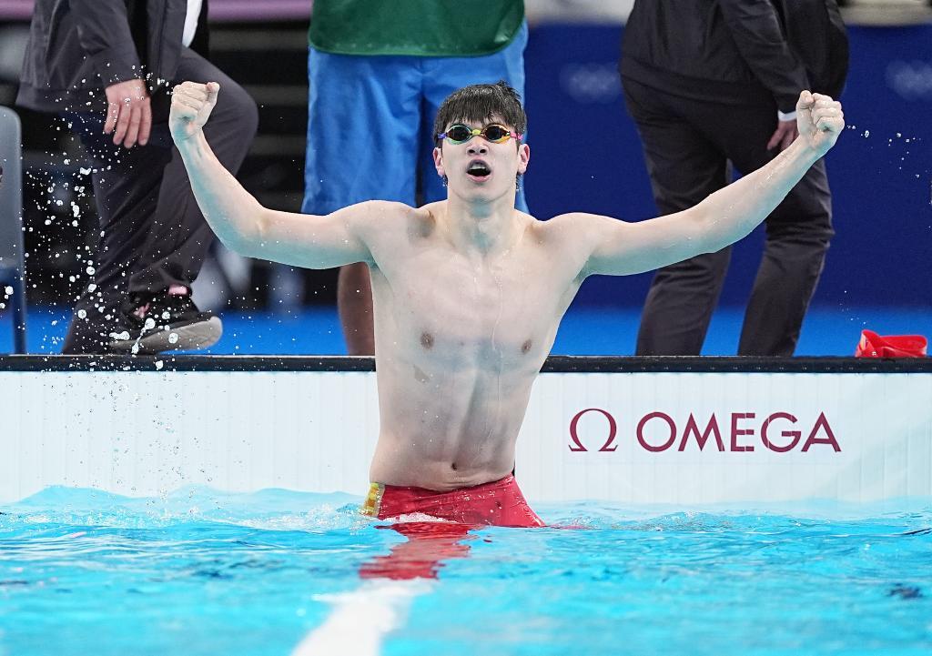 7月31日,在巴黎奧運會游泳項目男子100米自由泳決賽中,中國選手潘展樂以46秒40的成績奪冠并打破世界紀錄。圖為潘展樂在賽后慶祝。新華社記者 杜宇 攝