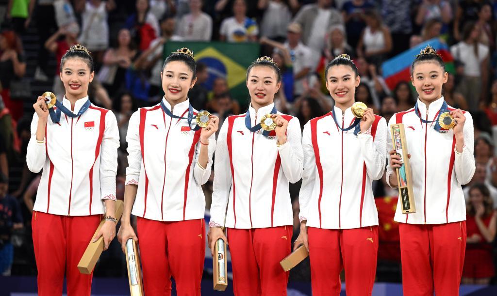 8月10日,中國隊在頒獎儀式上。當日,在巴黎奧運會藝術體操項目集體全能決賽中,中國隊獲得冠軍。新華社記者 程敏 攝
