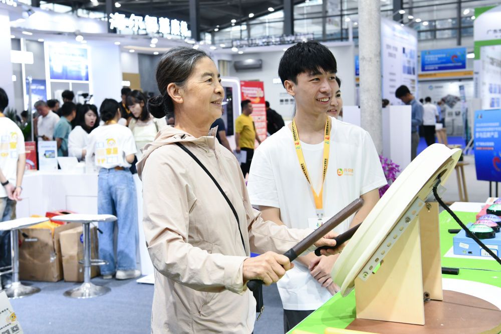 2024年10月27日,老人在2024深圳國際智慧養老產業博覽會上體驗樂齡鼓。新華社記者 梁旭 攝