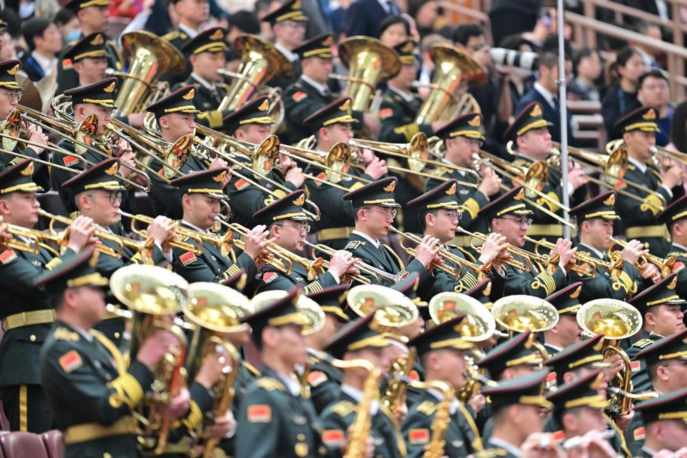 3月11日,十四屆全國人大三次會議在北京人民大會堂舉行閉幕會。這是軍樂團在演奏。