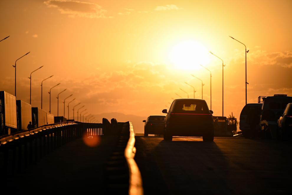 運輸公司工作人員將中國新能源車從霍爾果斯運向哈薩克斯坦一側中轉停車場。新華社記者 李任滋 攝