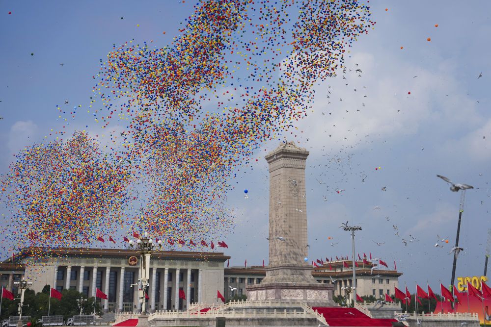 2025年9月3日,紀念中國人民抗日戰(zhàn)爭暨世界反法西斯戰(zhàn)爭勝利80周年大會在北京隆重舉行。這是紀念大會現場放飛氣球和鴿子。新華社記者 牟宇 攝